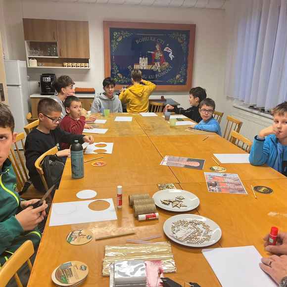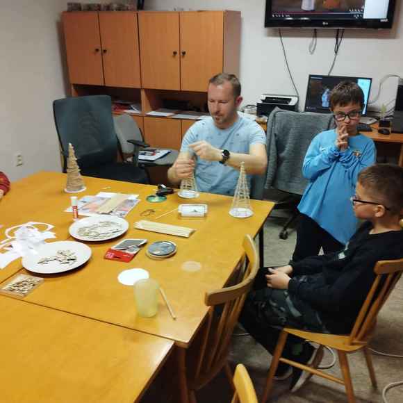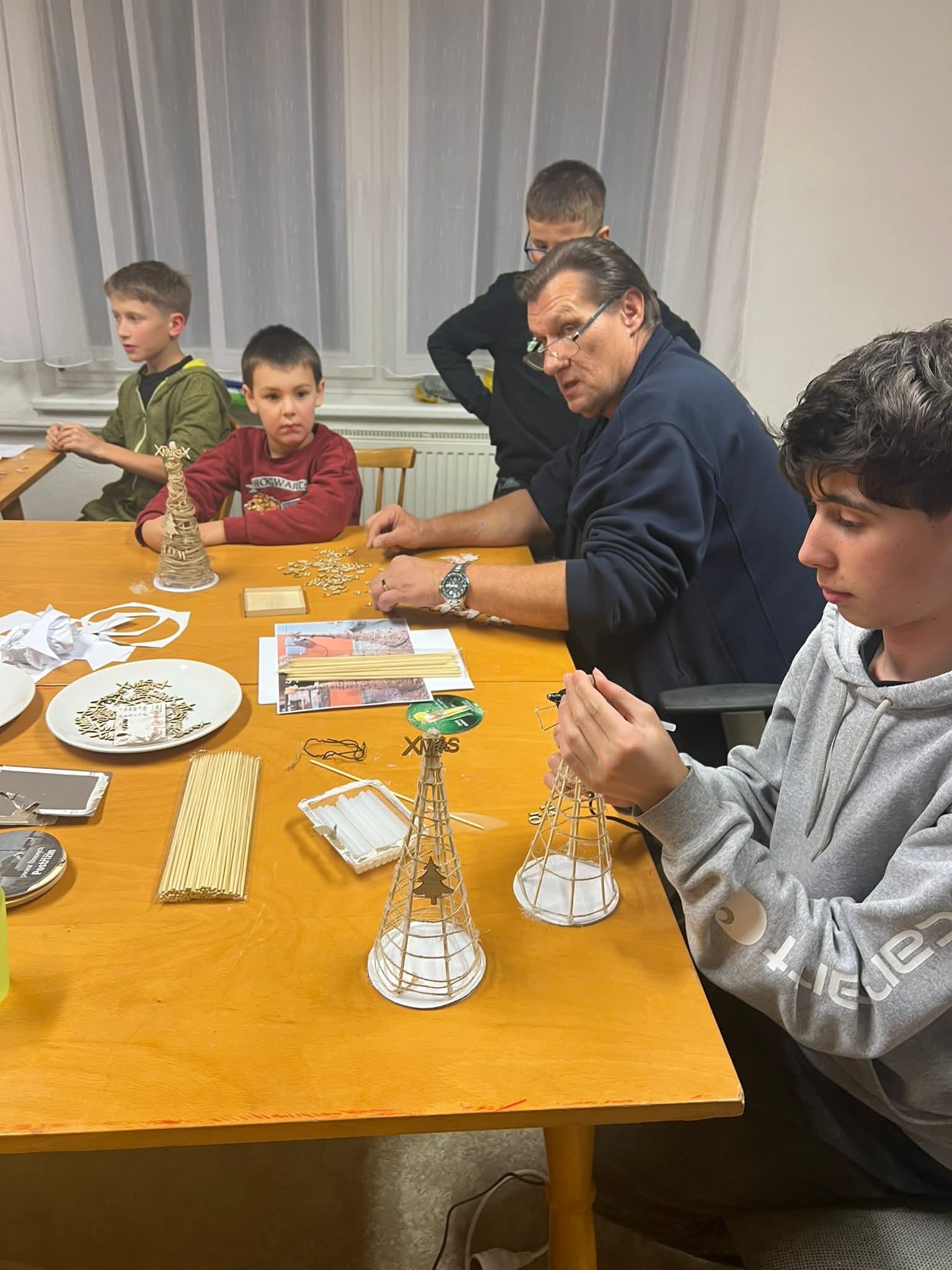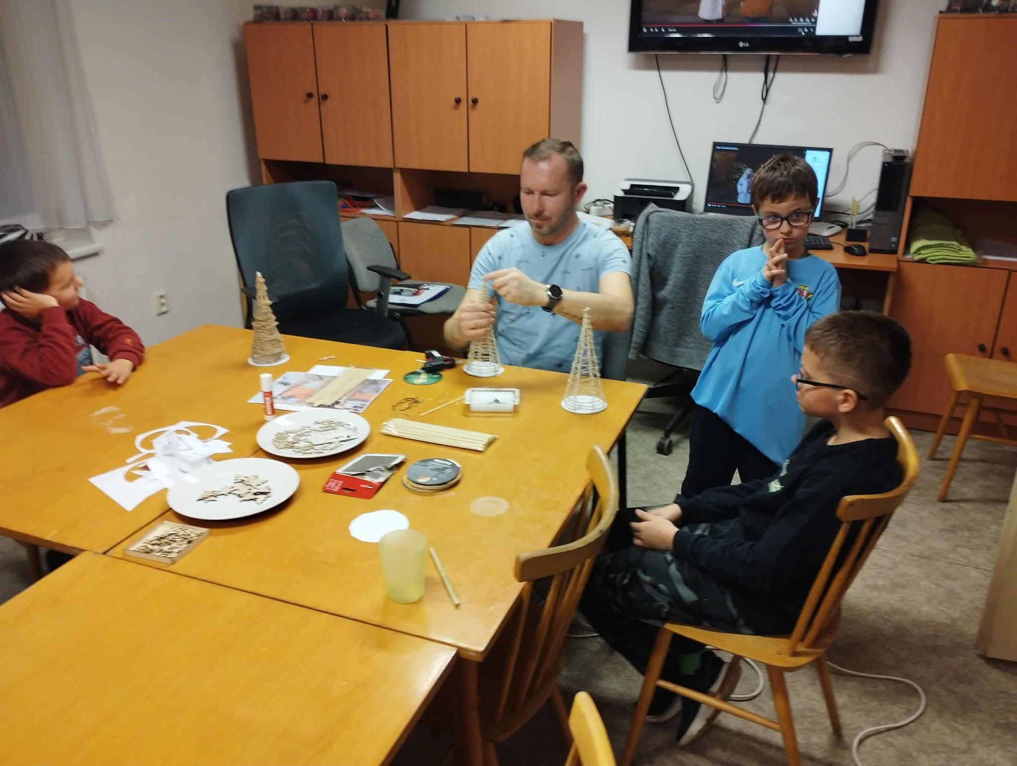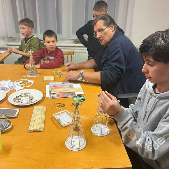 Na další schůzce si děti vyráběli malé vánoční stromečky ze špejlí a provázků, které si pak nazdobily podle fantazie. Tímto jsme si všichni zpříjemnili předvánoční čas.